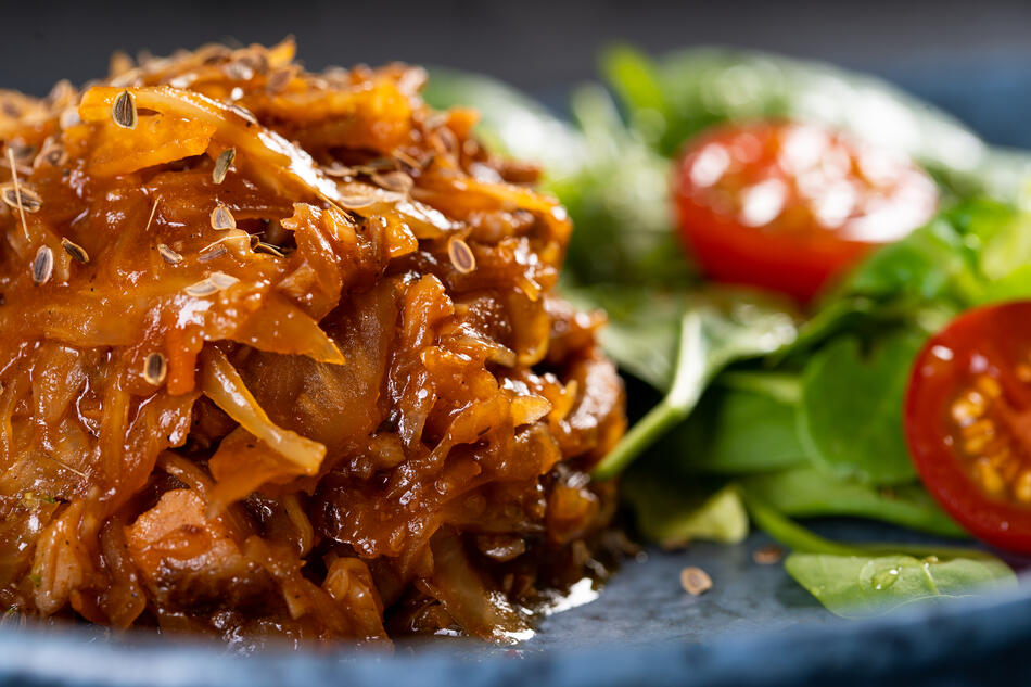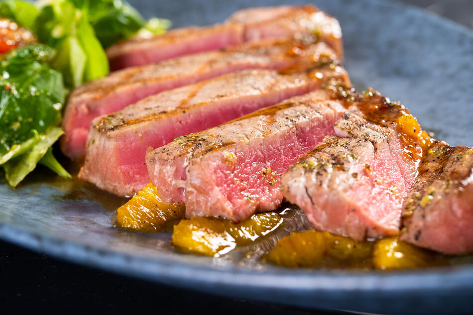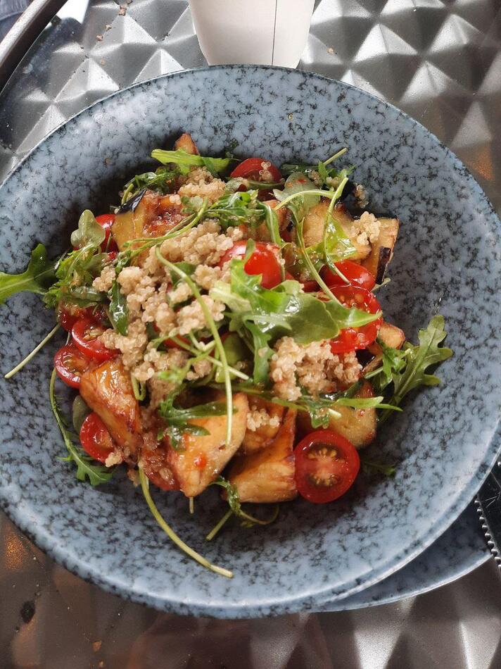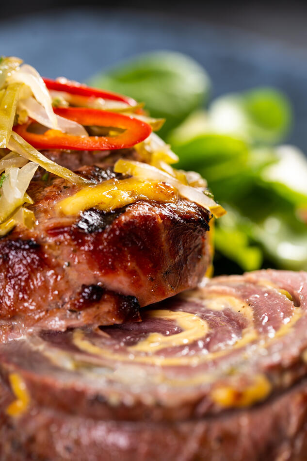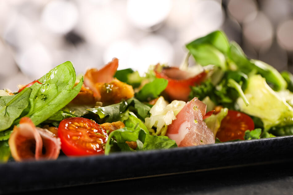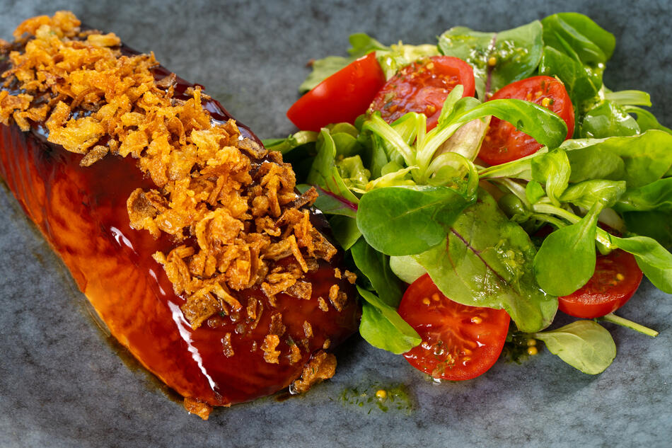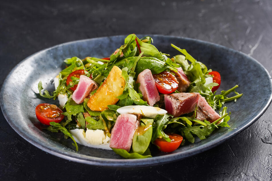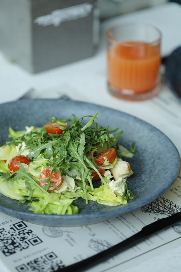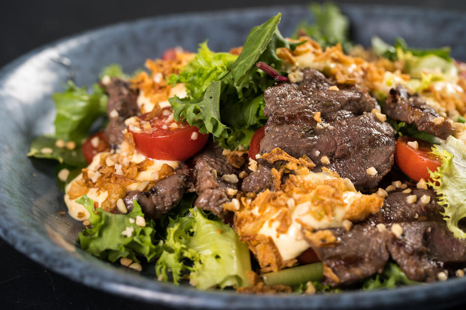 Микс салатов, говяжья вырезка, томаты черри, соус, лук фри, арахис дробленый, зеленое масло, соль, перец.