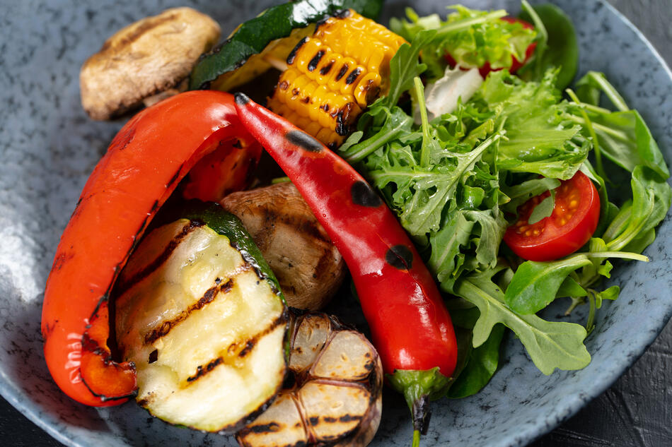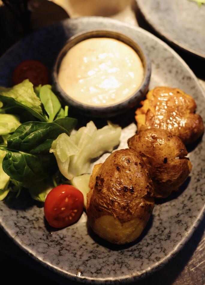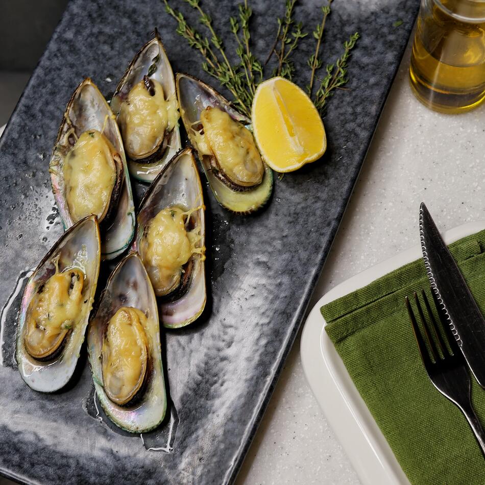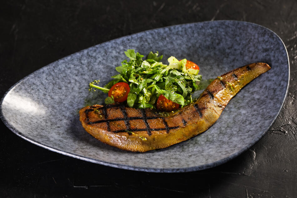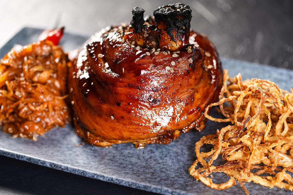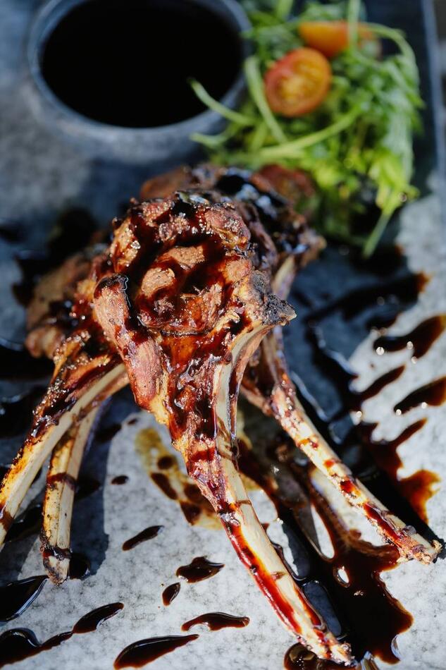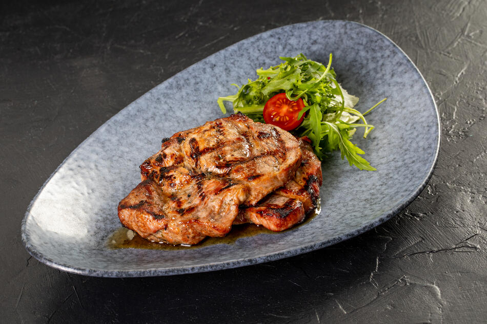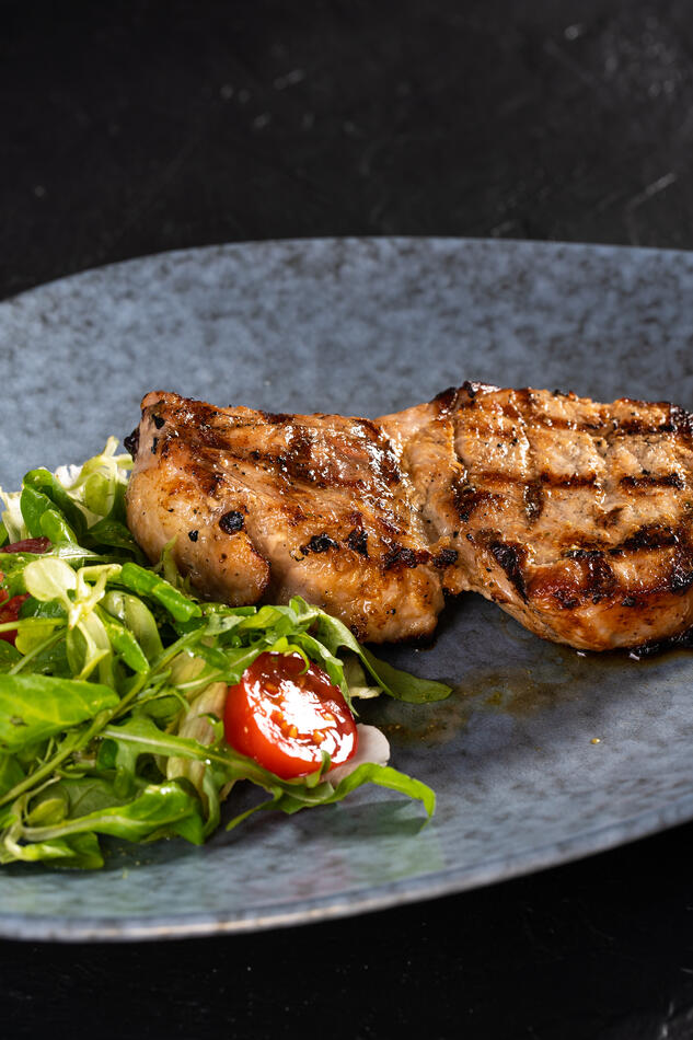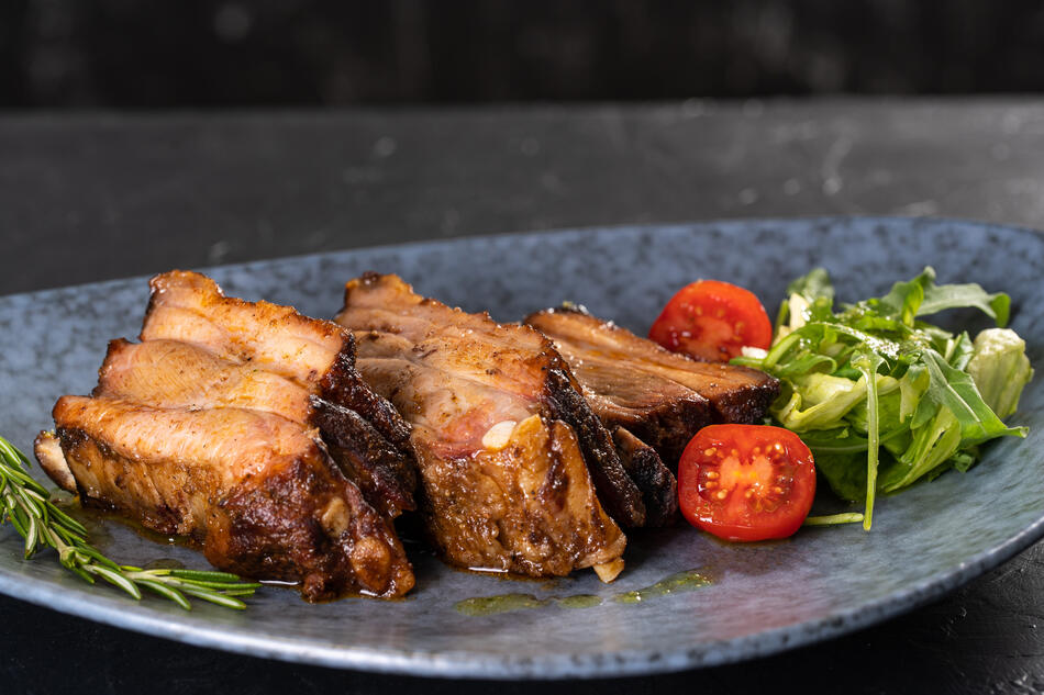 (корейка на кости, масло чесночное, масло зеленое, соевый соус, салат)