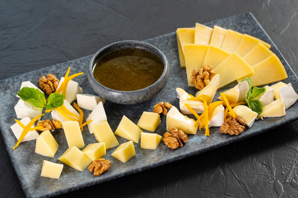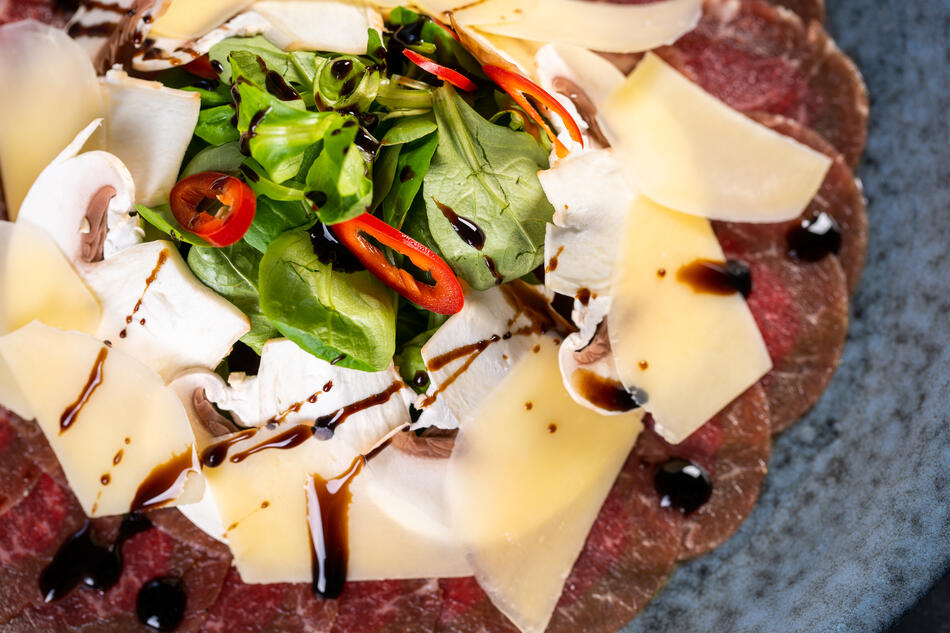 Микс салатов, дыня, брезаолой, сыр моцарелла, крем бальзамик и кедровый орех.