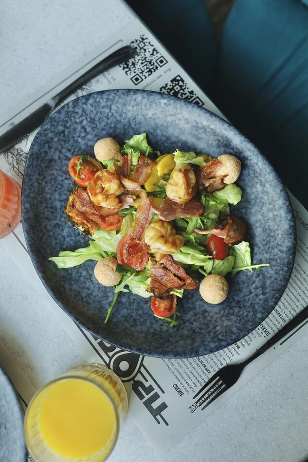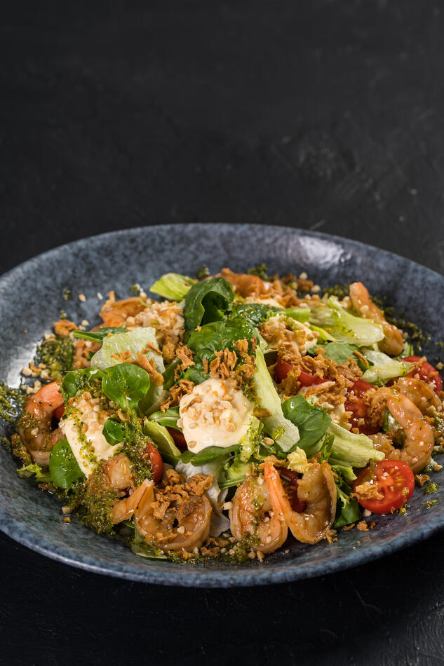 Микс салатов, креветки, лук фри, арахис дробленый, томаты черри, соус, соус терияки, соль, перец.