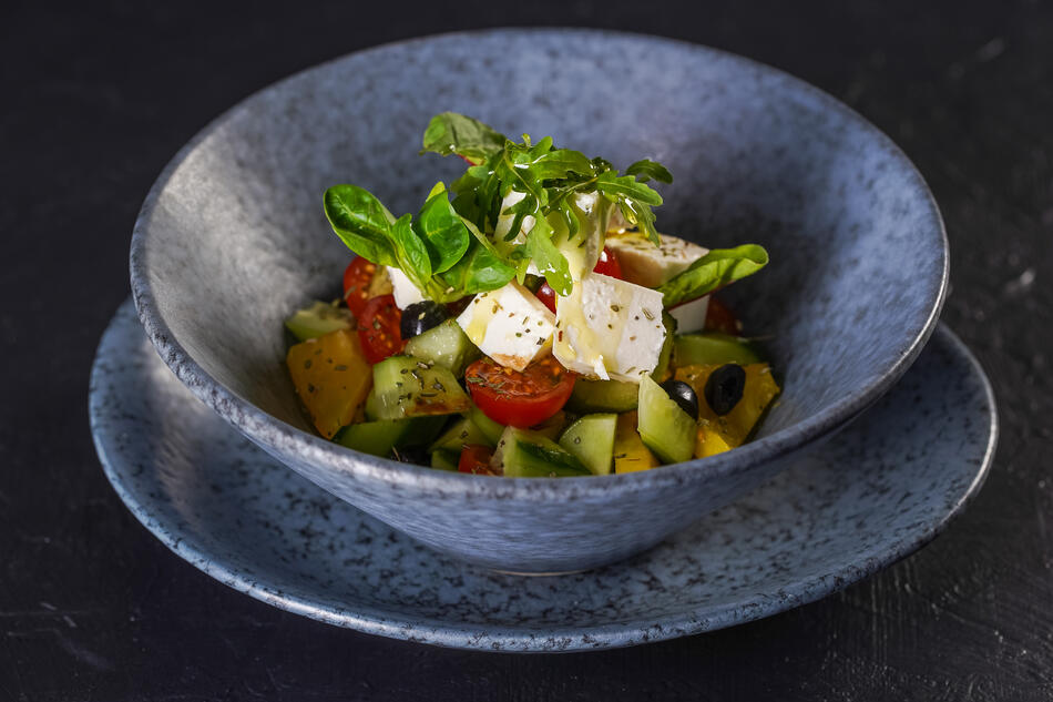 Томаты черри, огурец свежий, перец болгарский, маслины, сыр брынза, масло оливковое, салат микс, масло зеленое, уксус бальзамический, перец.