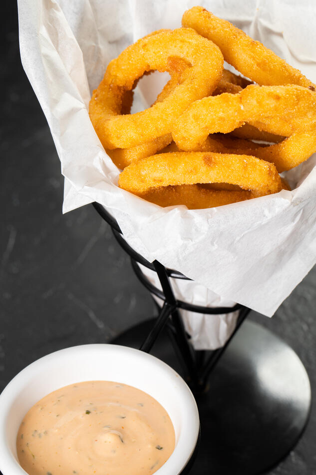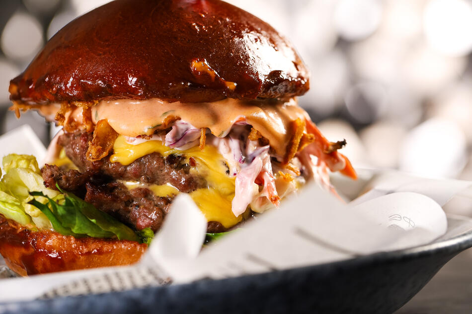 Булочка бриошь, салат коул слоу, лук фри, соус 1000 островов, котлета жареная, соус барбекю