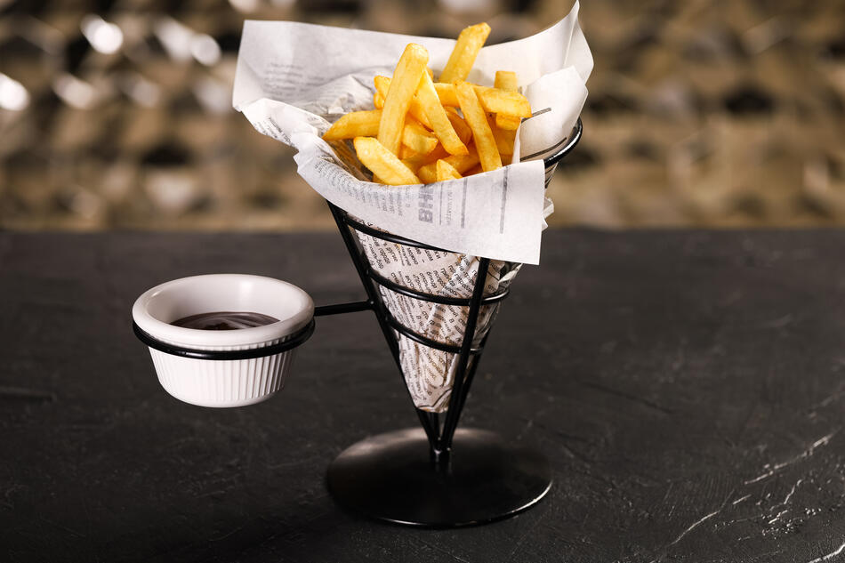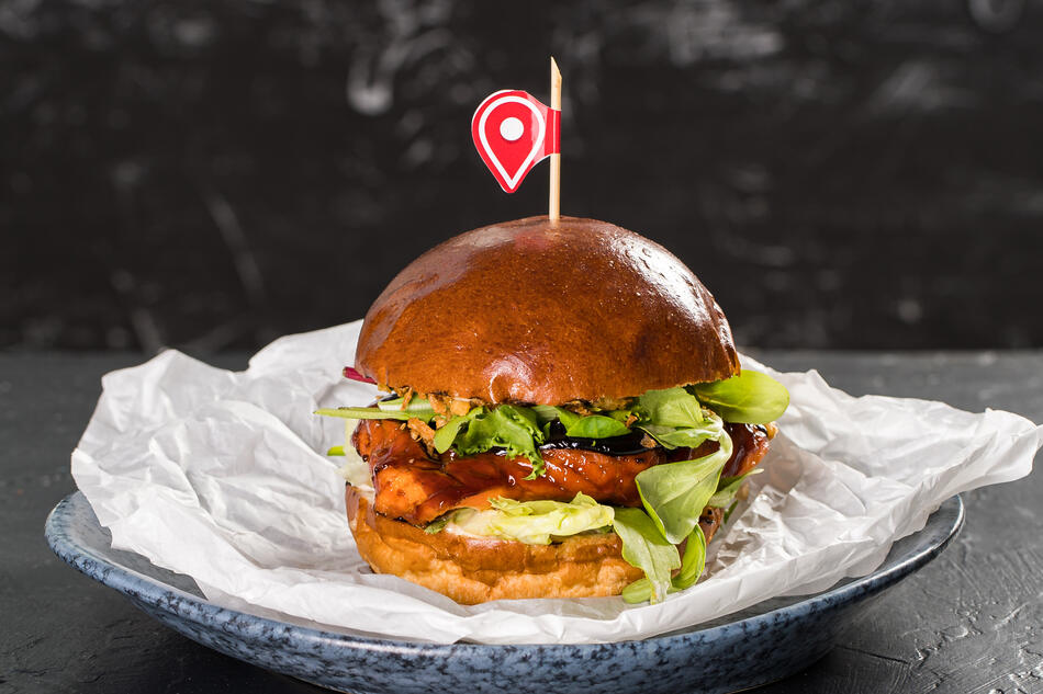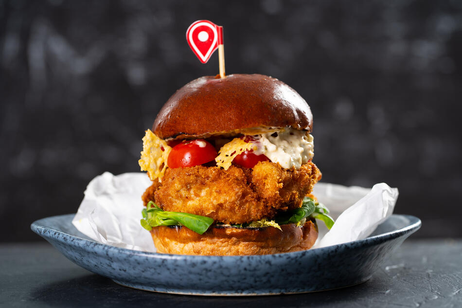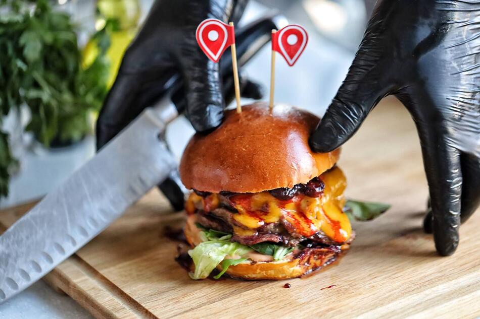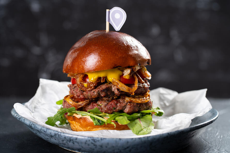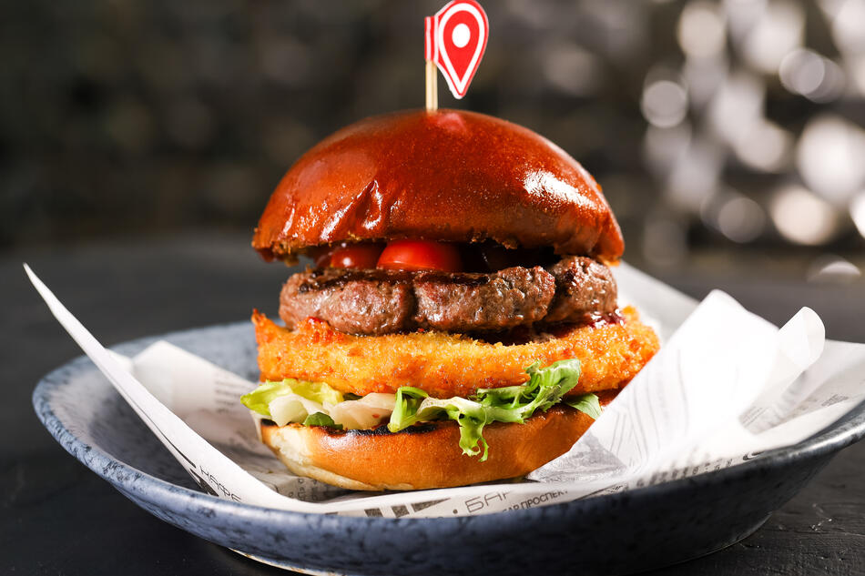 Булочка бриошь, 2 котлеты из баранины, зира, муштарда, соус "1000 островов", томатный соус, микс салата, томаты черри, лук фри.
